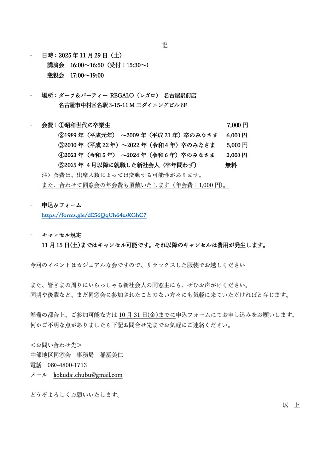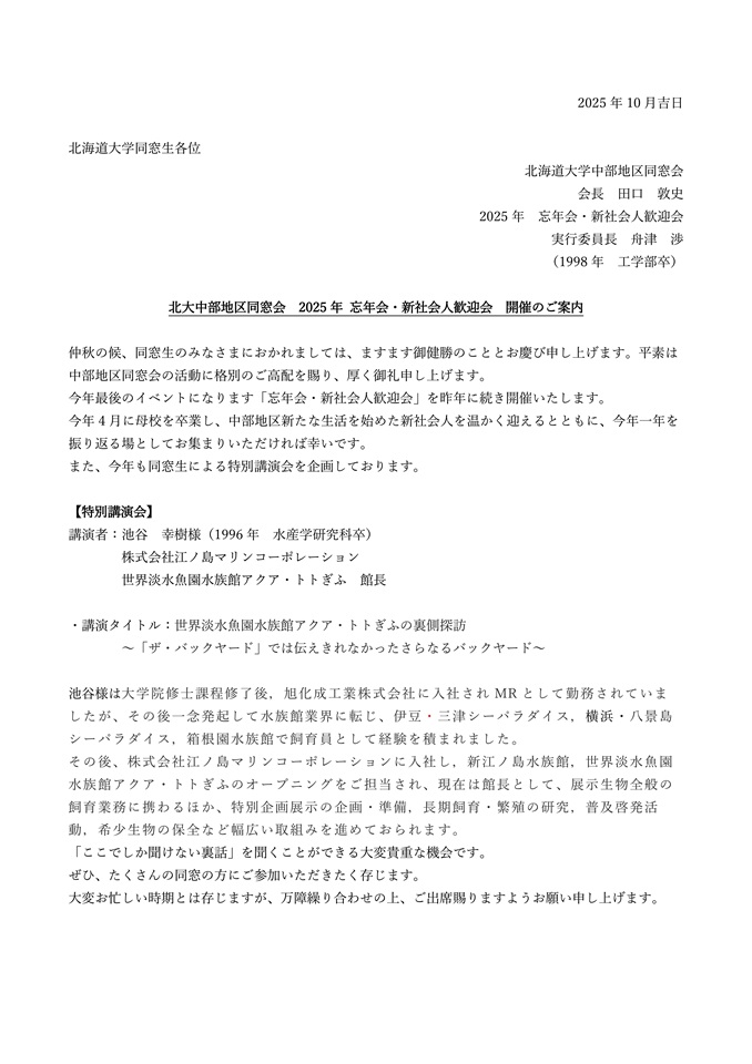 仲秋の候、同窓生のみなさまにおかれましては、ますます御健勝のこととお慶び申し上げます。北海道大学中部地区同窓会のイベント (2025年忘年会・新社会人歓迎会 (11月29日 (土))開催)のご案内です。(参加申込締切 10月31日 (金))ご興味ある方は是非ご検討をお願い致します。皆様のご参加をお待ち申し上げます。
