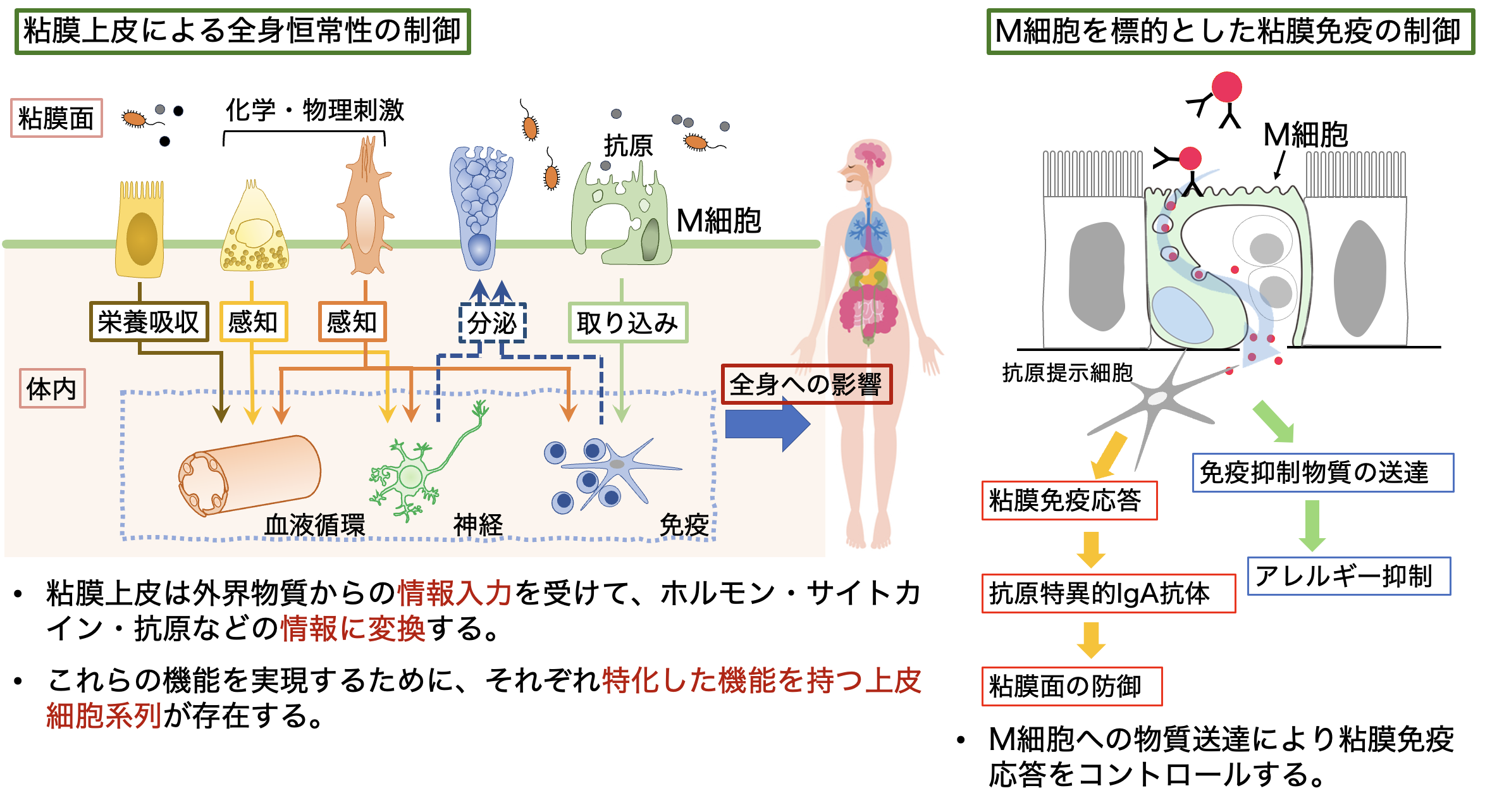 腸管や呼吸器などの粘膜組織は外界と接し、その内腔は上皮細胞に覆われています。粘膜上皮は、外来異物や常在細菌の侵入を防ぐ障壁となると同時に、環境情報を感知し、必要な物質を選択的に取り込むインターフェースとしても機能します。こうした多機能性は、多様な上皮細胞系列によって支えられています。
